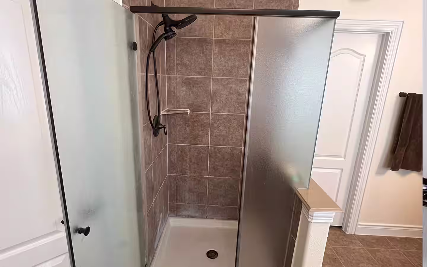 This project consisted of a full shower remodel with premium finishes in Almond and Tiramisu tones, featuring a custom frameless glass enclosure, Delta fixtures in Venetian Bronze, and functional upgrades like a pony wall, recessed caddy, and grab bar for accessibility. The remodel included complete demolition, plumbing adjustments, installation of new shower components, and finishing details for a high-end, durable result.
